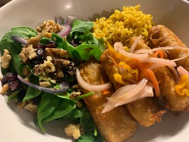 Grilled red onion, dried cranberries and walnuts on a bed of baby spinach topped with hickory smoked tempeh coconut vinaigrette
